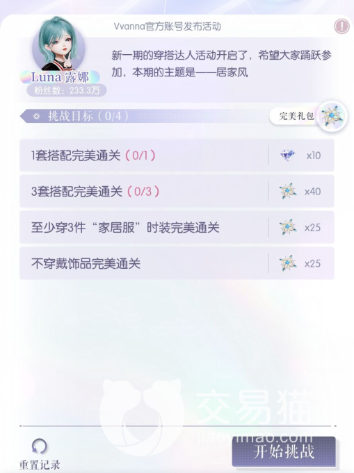 这里小编建议大家“不穿戴饰品”这个提前完成,因为这样就可以给我们后面留出更大的搭配空间,然后中间一次穿上3件家居服,这个挑战就可以完美通关了。