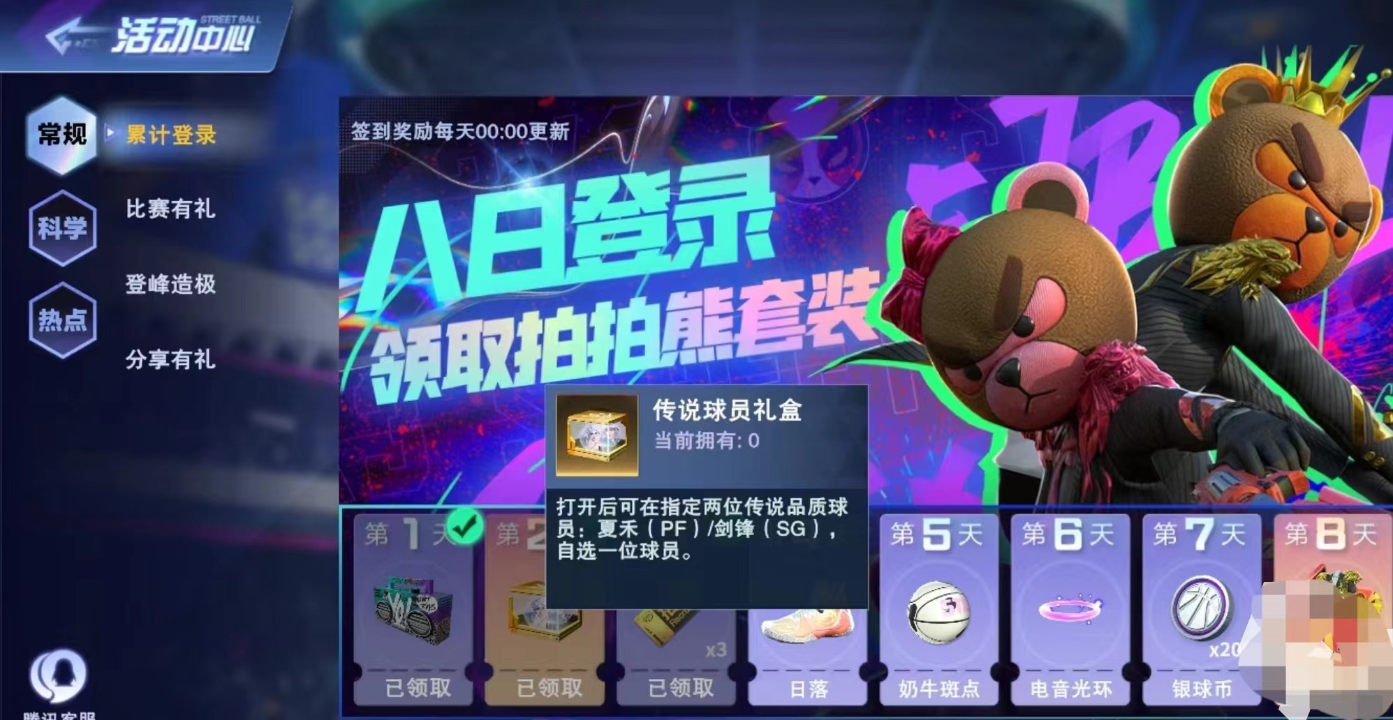大家想要知道,在全民大灌篮这个活动中,有什么活动的话,可以自行点击主界面的活动按钮就可以了,在这里也是将活动分为三大种类,和最不受限制的活动就是常规活动了,里面不会有节假日的区分,基本上是等于常住在这个游戏中了,而且里面有四个选项,那就是比赛有礼、登峰造极、分享有礼以及累计登录,而大家最关心的莫过于累计登录了,可以看一看有哪些奖励可以获得。