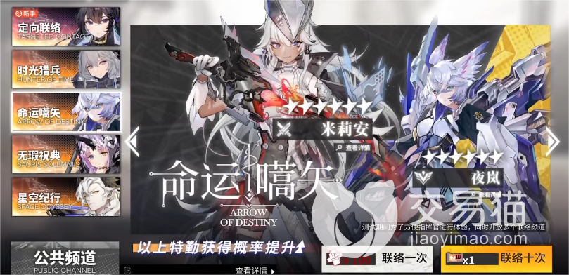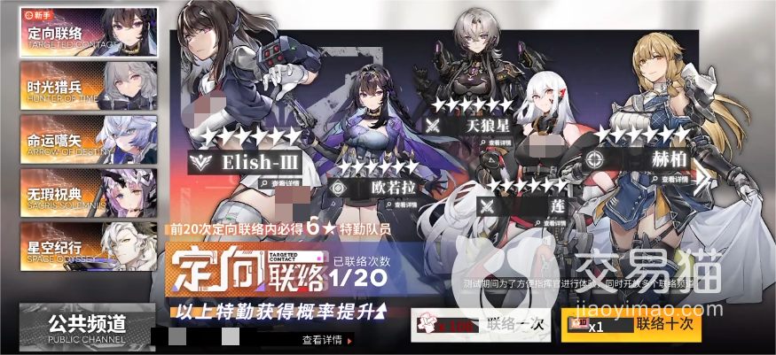 目前的卡池主要有五个,其中一些是在特定时间点才开放的,其中就包括新手池,这个是福利力度最大的一个卡池,其中主要有五名六星角色,包括“Elish-III”,“欧若拉”,“天狼星”,“莲”以及“赫柏”,并且它本身也是有着极为良心的保底的,只需抽二十次就能必得一个六星。