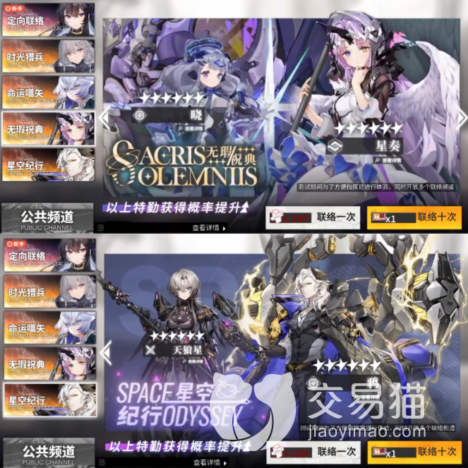 其他的几个卡池,包括“命运嚆矢”,“无暇祝典”和“星空纪行”它们和时光猎兵也都是相似的抽卡机制,大概每一百抽保底的样子,它们所提升的六星角色分别为“米莉安+夜岚”,“晓+星奏”和“天狼星+鸦”,这些角色每个都是强力的六星。