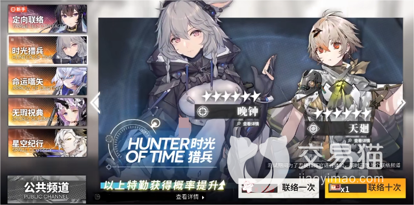 另外的四个卡池则是针对部分六星角色进行了概率提升的特殊卡池,内测期间由于为了方便体验全卡池都是开放的,等到正式上线它们应该会交替出现。其中的“时光猎兵”卡池针对的是“晚钟”和“天廻”,它消耗的抽卡券和新手池也是一样的,概率方面比较随机,但到一定次数也有保底。