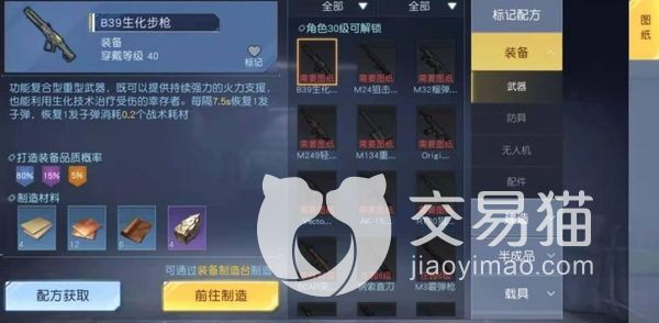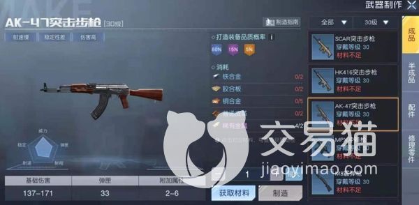 比如大家想要制作的是武器AK-47,就可以直接点击武器制作,来到该页面中,就能看到四个选项成品,半成品配件以及修理零件,大家若想制作这个武器的话,可以直接点击成品,在武器中找到AK-47,然后就能看到打造他所消耗的材料,点击下边获取材料去获取到对应材料回来之后,点击制造就可以了。