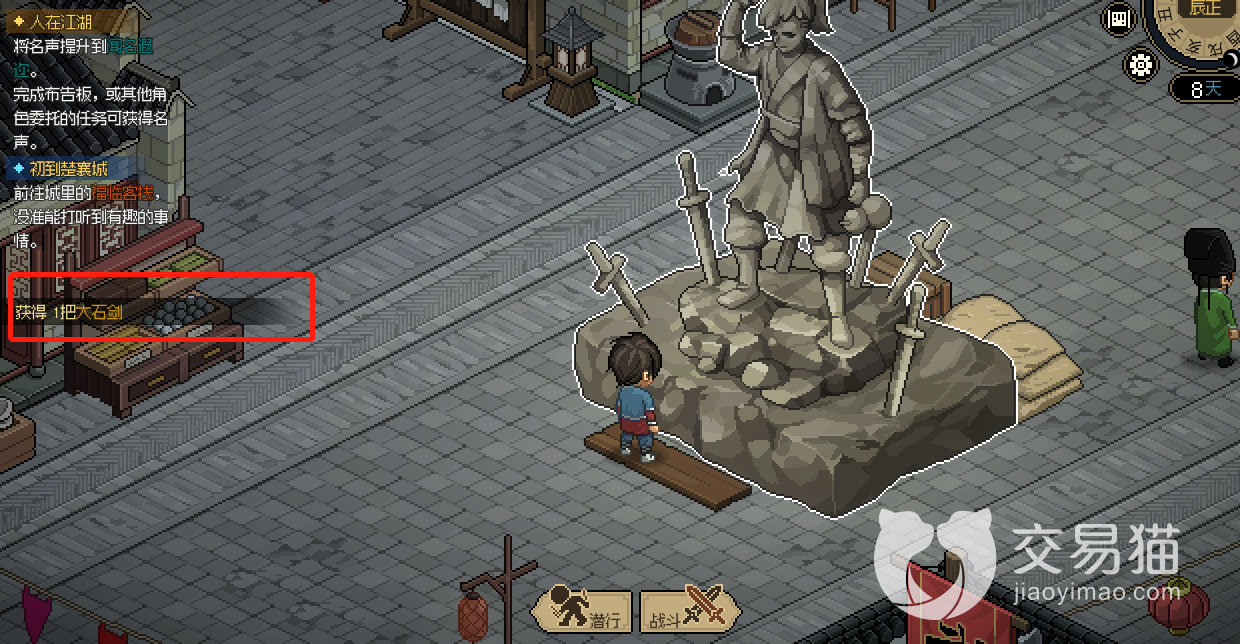 等到捶打一百拳的剧情结束之后,雕像上的大石剑就会掉落,此时主角会感叹一句精诚所至金石为开,然后你就能看到“获得一把大石剑”的提示出现在左下角,通过它橙色的字样可以看出其品质就是甲级,不过由于该武器属于长剑,因此需要习得相应功法才能使用,所以大家想即刻使用的话还得在开局或前期阶段使自己的角色习得此类功法。