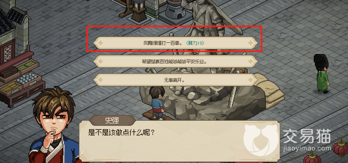 点击该石像即可触发一段剧情,剧情结束后会出现两个选项,当然,想获得甲级武器你得需要出现“向雕像捶打一百拳”的第三选项,该选项的触发就涉及第二个前提条件,那便是“臂力达到10”,因此如果前期就像快速获取甲级武器,那么你在开局选择属性和特征的阶段肯定得想办法将臂力点满。