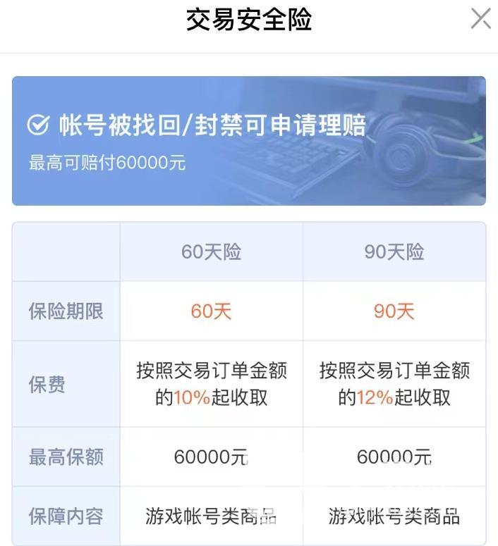 买号注意的点大家要知道,特别是在线上渠道的话,平台就有着至关重要的作用。交易猫平台给到买家的服务在购号时就能看到,一般下单买号时会有个交易安全险,需要买家选择性购买,主要保障在账号被找回或者封禁的情况下进行理赔的,有六十天还有九十天的选择,其中最高的保额都是六万之多,保障游戏账号类商品。另外如果是安心购中自带保险赠送的话,此项服务大家就不必再购买咯。