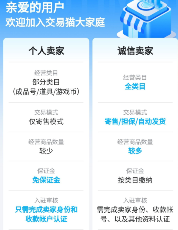 大家在交易猫出售商品的时候,需要点击主页中的我的,然后进行实名认证,并且关联芝麻信用。如果玩家的芝麻分越高的话,将会更让我们的买家信赖,买家在多方比较之后,肯定会更加偏向于选择我们的账号哦。然后大家即可点击我要卖的按钮,搜索部落冲突。进入到部落冲突的上架模板,按照模板内容去填写自己的账号信息。另外大家还可以选择成为个人卖家还是诚信卖家,他们之间的区别,大家可以仔细看一下下图。