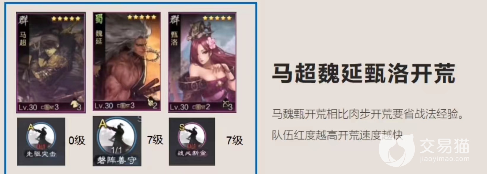 第二个队伍马超魏延甄洛也是经常看到的开荒阵容。这队要比甄洛肉步能省下不少战法点数。开荒比较丝滑,但是后期打皮可能会很伤,这对马超战法先驱可以先不用升级,磐阵和战要求等级先升到七,这队转型最多的是砍王队伍。