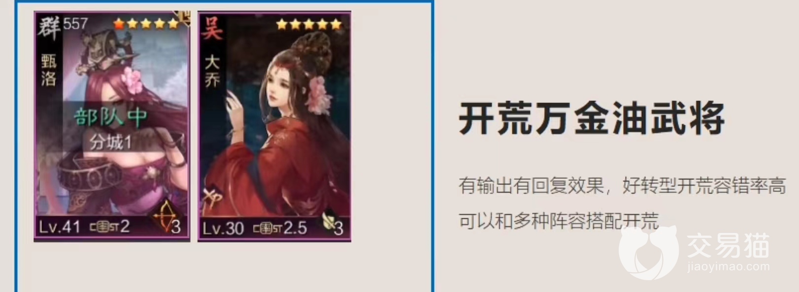 先说一下率土之滨中比较全能的开荒万金油武将,一个是甄洛不管是肉队还是砍王。甄洛搭配还可以从组蜀骑开荒,在率土之滨里面称之为洛神,大乔同样和甄洛都有不错的恢复效果,大乔有回复有输出,好转型后期可以转吴步,剑影在这里拿出来最常见的甄洛肉步开荒。甄洛携带桃园每回合使我军兵力最低武将恢复一次兵力。第五回合开始对敌军发动一次策略伤害,这对开荒前期特别的慢,但是特别的稳。这队开荒前期开始要多注意一下,尽量选择简单的四级土地首开,加点推荐桃园满级,利兵和垒石升到七级即可。不管打什么阵容都能打得过,陆抗无心恋战平替战法可以上避其锋芒,如果没有垒石,周泰可以上单骑救主。单骑救主和桃园有冲突的原因。桃园结义可以换成风声。