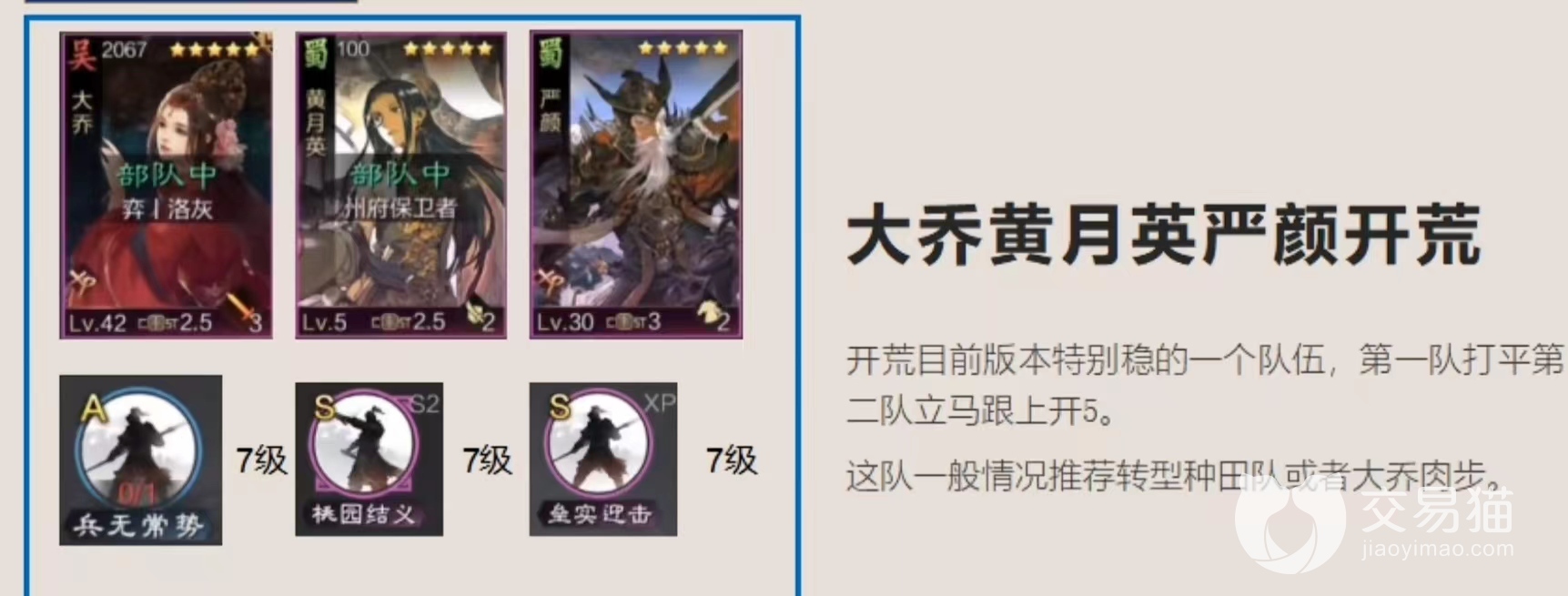 但是小编在这里推荐去玩公孙瓒勠力同心菜刀队,因为双追战法搭配穿透力特别厉害。前两回合就可以打出不低的伤害。最后推荐这对是邀请赛特别亮眼的一个开荒队伍。这个队伍3900兵力也就是13级。就可以去尝试开五级土地,然后二队顺利补刀。虽然兵无常势被削弱了一半,但是小编认为他还是拯救大头兵的不二选择,简单来说就是可以防止被暴毙掉。
