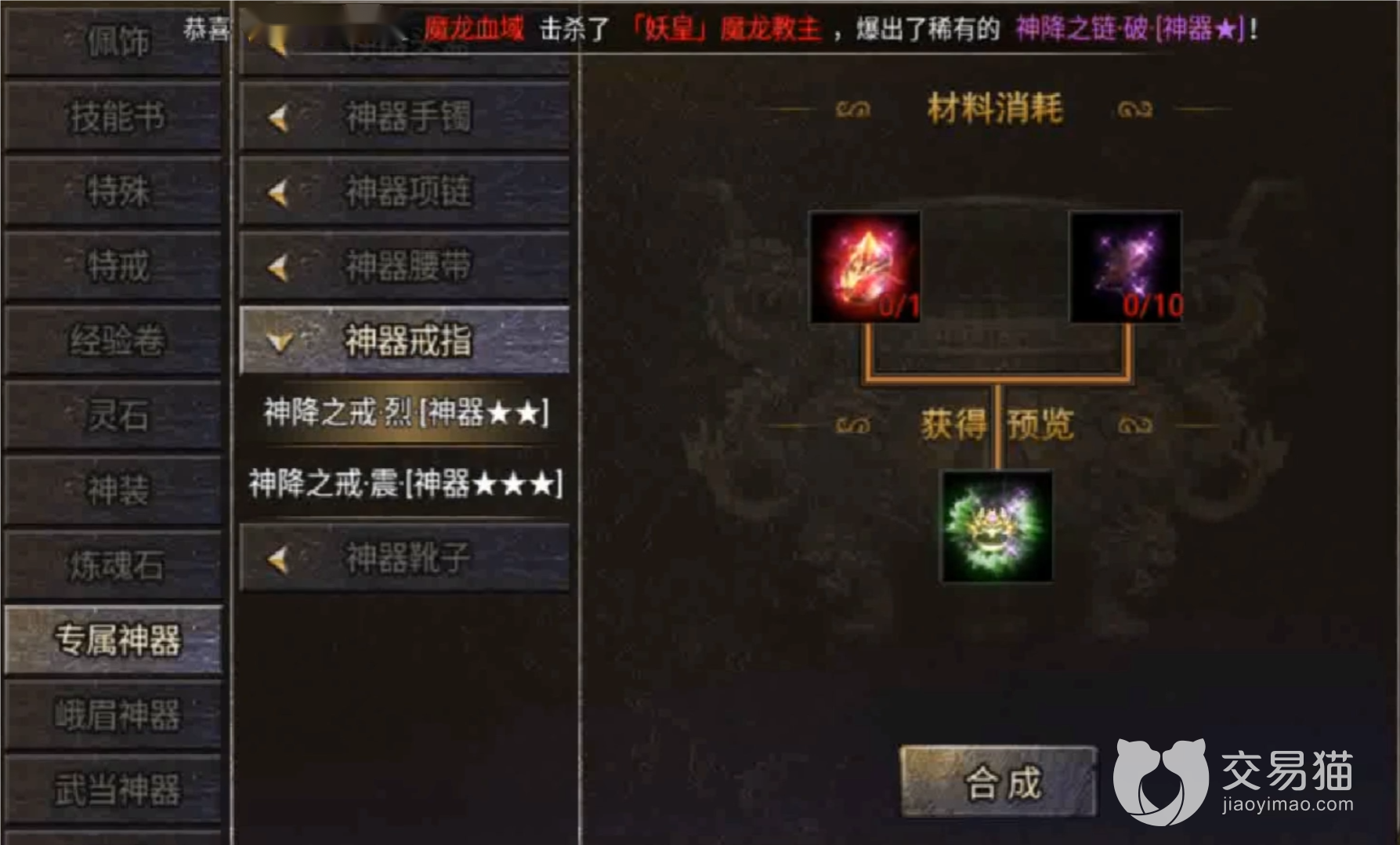 这类法宝需要击杀强大的boss掉落,这是获取的最佳方式,每一个的boss的掉落概率都是非常的低的,所以玩家想要搞到这个神器需要消耗花不少的时间来挂机,而且如下图所示这里面的神器法宝数量众多,相比一般的道具都有自己特殊的外貌。