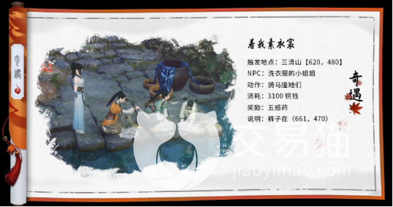 在桃溪村,骑马撞到洗衣服的小姐姐之后就会触发任务,接着会出现奇遇的卷轴,就说明任务可以做,玩家按照任务的流程继续往下走就可以,假如没有触发任务,建议玩家们可以收集碎红玉,然后去谨言童子那里兑换,能够提升人物五感的丹药,重新尝试触发。