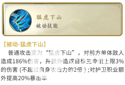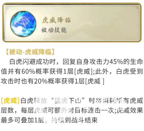 它是四圣兽之一,非常强大的战士。被动猛虎下山可以对敌人造成伤害同时还附带最大生命值的百分比扣血,如果对手的身份是护卫的话,还会提高20%的暴击率,并且普通攻击就可以触发这个效果。而白虎之影会提高自身的生存性,获得闪避和控制免疫的效果,而闪避成功是将获得自身的治疗,以及虎威效果,此状态下将会拥有额外的联机次数。