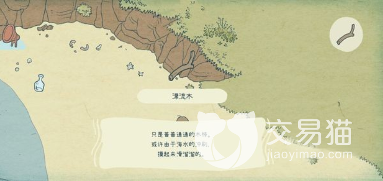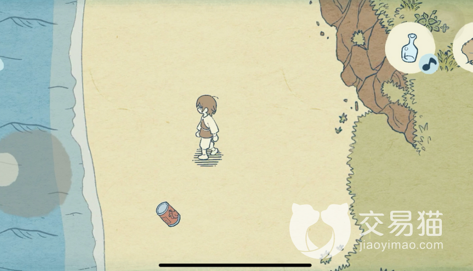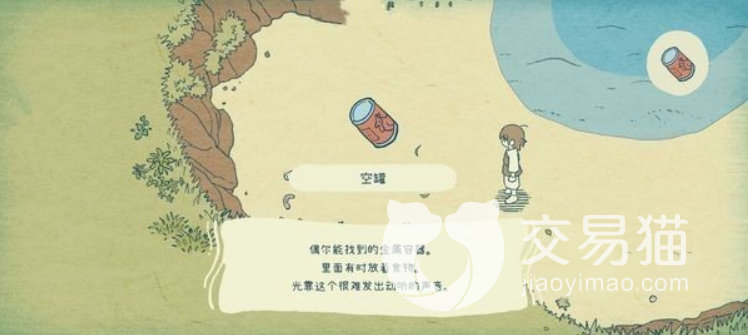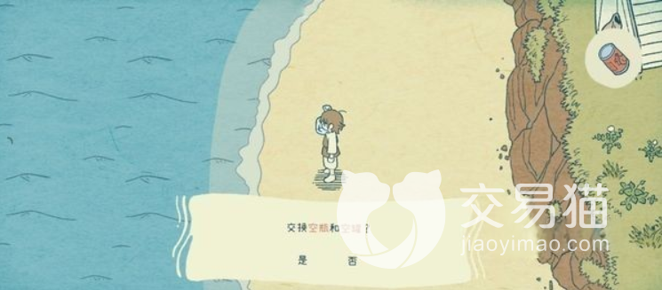 对话玩之后,我们需要走到右侧的沙滩上,会看到地面有一个罐子,捡起来之后就会触发对话。看完之后,我们还要继续往前面走,再走到右侧的沙滩处,就能够看到一个空玻璃瓶了。想要拿到这个玻璃瓶,就得用空罐进行交换。也是因为这个游戏的设定,每次只能够拿到一个道具,毕竟右边的卡槽就只有一个,玩家们也要注意别拿错道具。