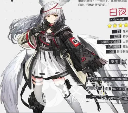 白夜这个角色在游戏当中是一位五星级角色,而且是突击职业,阵营来自兄弟会,并且是现任会长的义女,是一个温柔内向的哈涅女孩,表面看起来柔柔弱弱,但是在战场上厮杀很有能力,技能有残心,霞云,山风。