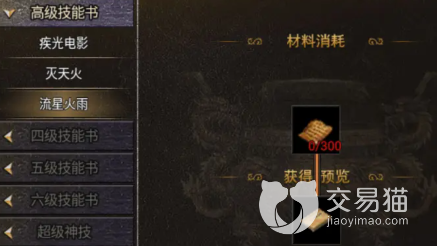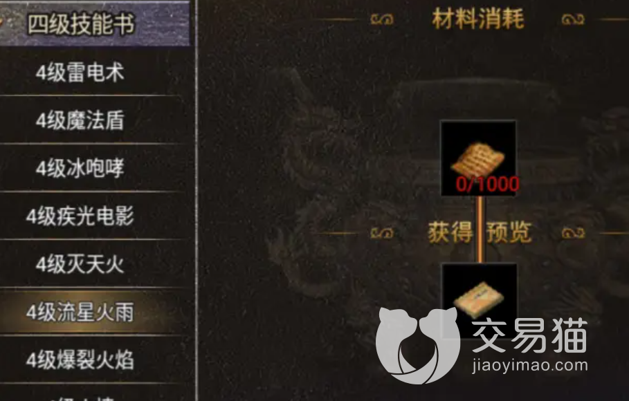比如这个疾光电影和灭天火,还有常用的流星火雨,是玩家首先会选择的几个输出技能,这里面列出的还只是一般高级的技能,在后面还有四级的技能五级的六级的,甚至是最强的超级神技,强度呈现几何式的上升,相对的材料也是需要的很多。
