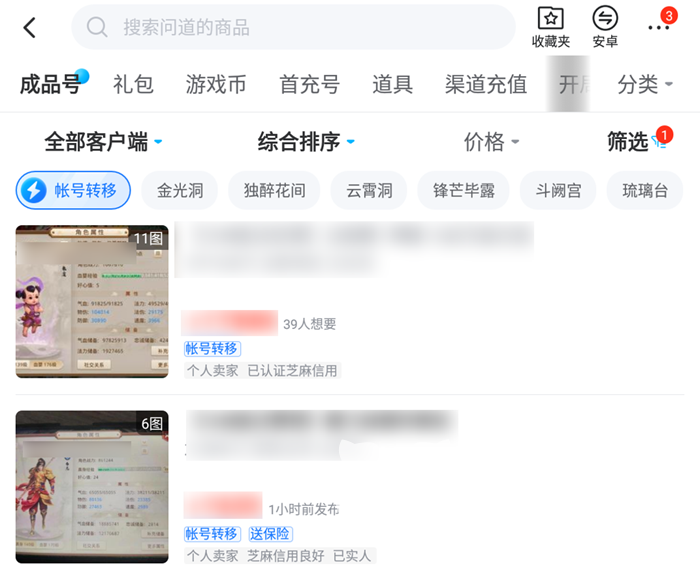 大家在挑选问道手游商品的时候就能够使用上方的快捷标签来选择账号转移,在购买带有这个服务的账号之后能够将其中的游戏存档和数据无损迁移到自己的号中,这样就能够避免被找回或者是封号的情况了。以后如果不想玩了,也更容易出手。