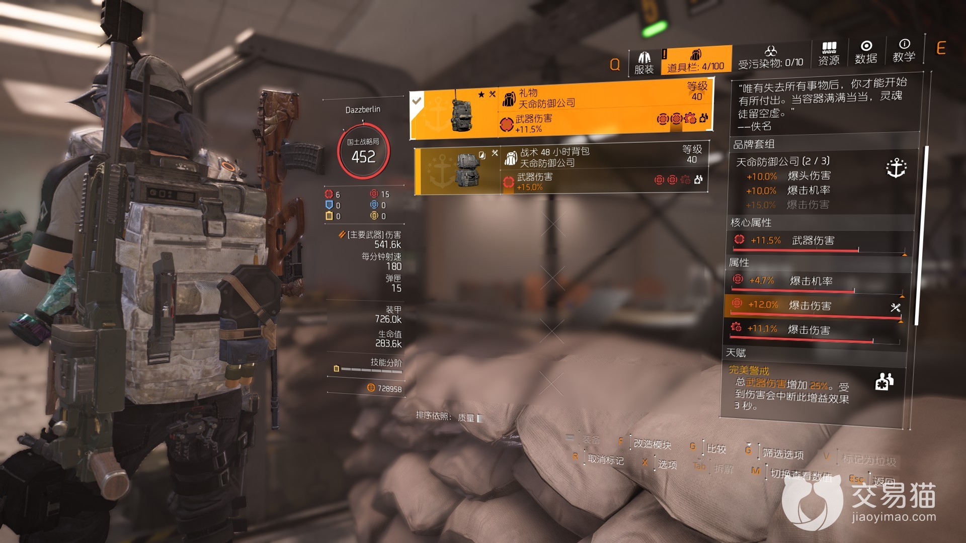 礼物这款具名背包本身拥有的独特词条,是完美级的警戒属性,可以直接常态化提供百分之二十五的总武器伤害提升,极其简单粗暴的背包加成了,不过会因为受到伤害,暂时使这个增益消散三秒,所以打法上要保持躲避伤害,保持加成。