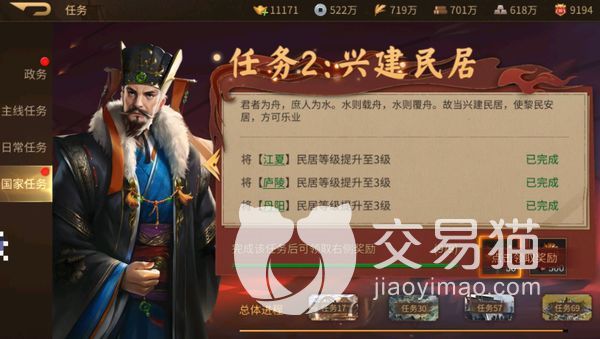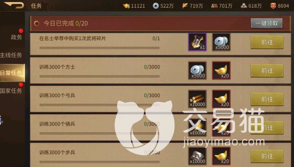 同时,日常任务的数量非常多,在这些任务中大家可以直接通过上面所描述的奖励来获取自己所需要的东西,比如元宝或者是银币等,当大家在游戏中获得这些道具之后,就能给自己的武器带来强化效果,并且经济情况不好的玩家也可以在这里完成多项任务来改善一下自己的经济情况。国家任务主要是需要在同国家阵营内的所有玩家一起完成的任务,当大家达成这些任务之后,还能获得大量的元宝以及功勋哦,在这个游戏中,功勋它主要的作用是提升角色的爵位,获得的功勋越多的话,角色在游戏中的爵位则会越高。还有一个政务任务,完成这个的任务主要获得的是游戏中的道具,并且这项任务有三次机会进行刷新的,大家可以通过这里获取自己需要用的道具,也可以等时间到了自动刷新,能够加快大家在前期的发展速度哦。
