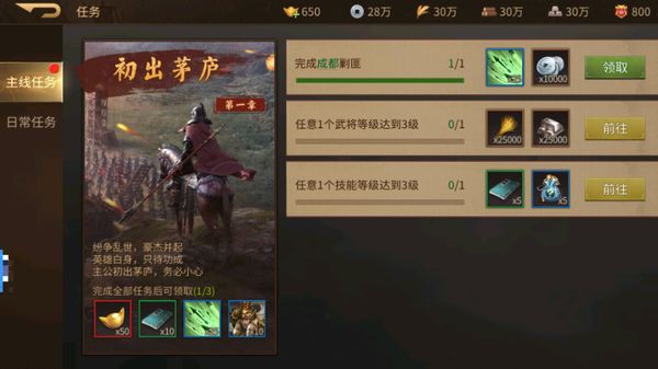 通常到这一步,很多新手玩家都不知道该怎么去操作了,其实接下来大家只需要去完成主线任务以及游戏中的日常任务就可以了,这样能得到很多的奖励,这些奖励能帮助大家快速提升等级。在这个游戏中主线任务是比较多的,在新手玩家前期主要是获得的一些元宝以及武将技能碎片等道具,只要大家在前期完成这些活动,就能获得这些道具来帮助大家提升等级,基本上满足了新手玩家在游戏前期的需求,大家还需要注意一下这个主线任务,它是分成不同章节的,第一章初出茅庐里面有三个任务完成,这三个任务完成之后才能进行到第二章,若是第一章无法通过,也就无法开启第二章了。大家通过第一章之后会获得一个武将名为马超,在后面完成第二章也能获得许多武将哦。