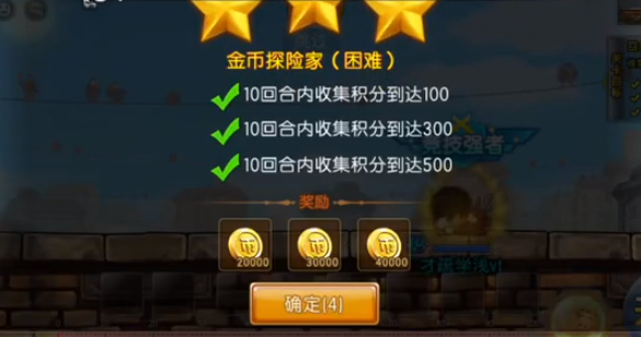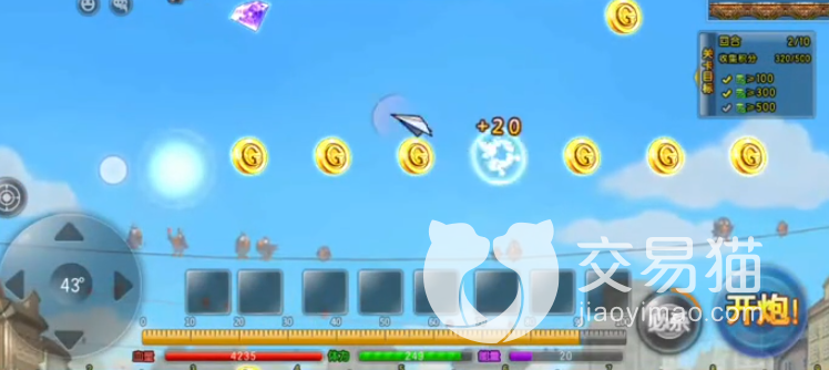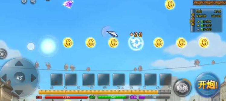 接下来给大家介绍的叫做金币收藏家的限时副本模式。这个副本玩家进入了之后,一开始的几个金币玩家都可以通过自行爬行获取到后面的金币,就比如第1个斜线金币玩家需要蓄力达到整个蓄力条的2/3的地步接着发射。眼前的金币可以获得80%的数量。接着转过身来调整角度为43°蓄力和刚才一样的2/3。因为金币收藏家这一关比较简单,玩家只需要到达规定的分数就可以了。因此小伙伴们可以多发射击炮,将所需要的积分打下来之后就能成功的获得了胜利。
