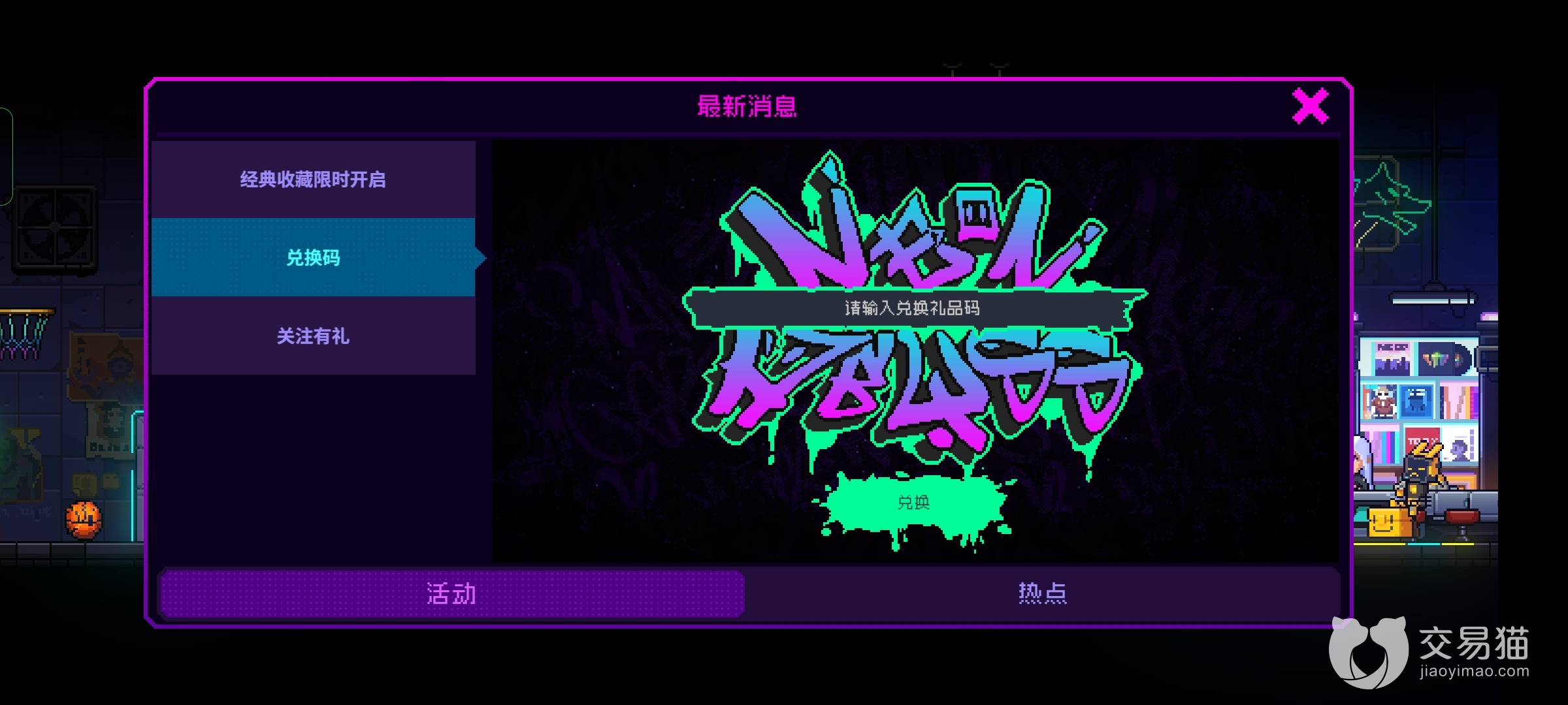 然后就是开服的兑换奖励,输入官方给各位的口令一次可以获取一个霓虹币,知道的各位往里面输入能领取超多的奖励,并且这个还是每个版本都会送的奖励,永远领取不完。