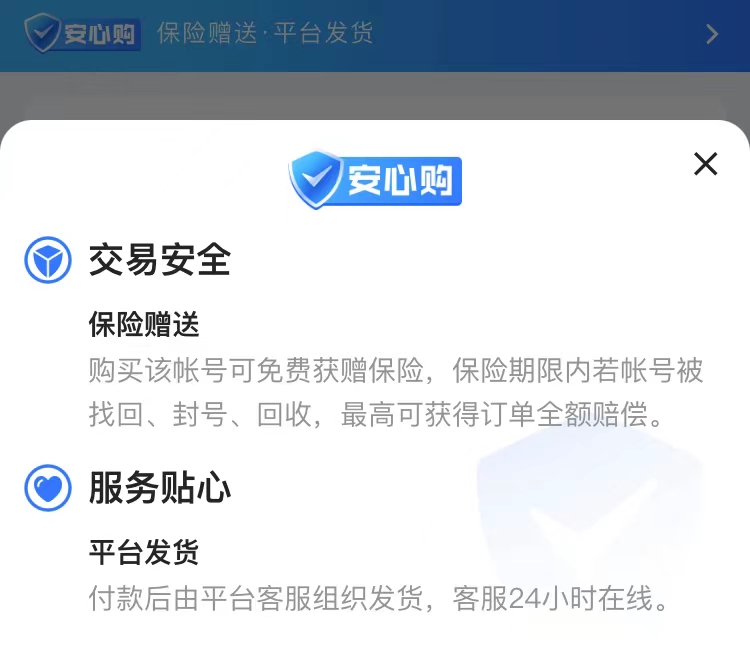 另外平台上购买部分优质的账号是有服务赠送的,就比如保险赠送。如果没有安心购服务的情况下,买家需要自己购买,这就又是一笔开支了;有了保险赠送,就无需考虑这一点,所以建议大家可以看一下商品下方是否有安心购服务,不仅能省钱还能省心,非常给力的服务。
