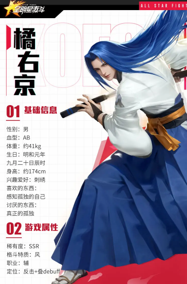 橘右京是也是强力辅助之一,天花板级的能力,主要是给对手附加虚弱以及重伤,这两种异常状态基本上都很熟悉了,前者是让对手大幅降低输出能力,后者是削弱回血效果,另外他还有几率招架敌人的进攻来进行反制,造型最大生命值的伤害,没有一个技能是鸡肋,值得率先拿下。