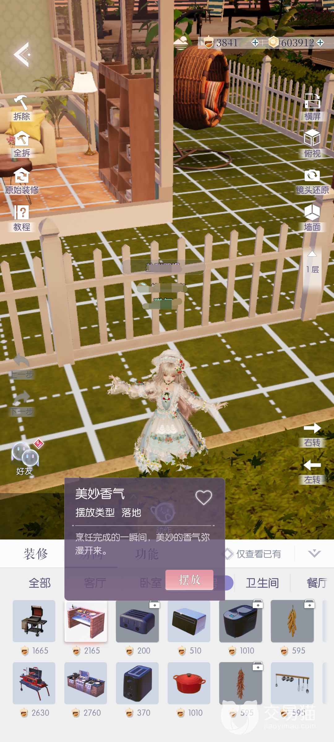 在进入了这个建造模式以后,玩法就更多了,我们既可以点击下面的家具来进行摆放,还可以直接点击左边的“拆除”来去掉一些不喜欢的建筑,或者点“全拆”直接推倒重来,除此之外,我们还可以在建筑的时候切换视角,方便自己更好的摆放物品,最后再镜头还原来看具体效果,非常方便。