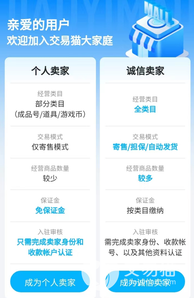 那么当各位了解了交易猫的估价方式之后,如果有打算将账号出售的想法,就可以直接在平台内申请开通卖家身份了。针对普通玩家来说,目前开通个人卖家十分的便捷,除了可以让大家售卖游戏账号,同时还可以让玩家将一些游戏资源道具发布到平台内进行交易。