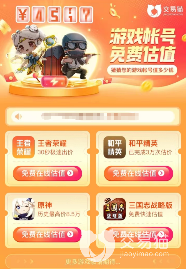 首先,对于所有的王者荣耀玩家来说,使用交易猫的一大好处就是目前平台开放了针对此游戏的系统估价功能,各位只需要将自己的账号内容进行填写,那么系统会自动根据目前的交易行情提供一个可参考的交易区间,自然也会帮助到大家了解游戏号的具体价值了。不过此功能在当前阶段,只针对四款游戏进行了开放。