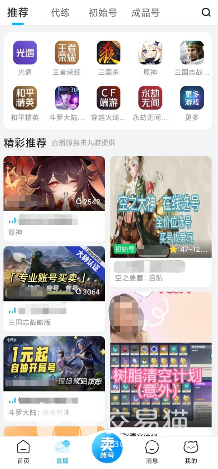 熟悉了流程过后,如果玩家已经厌烦了常规的商品挑选页面,可以来尝试一下交易猫中的直播专区。在这里区别于传统的商品交易,主播将在直播间内展示各种游戏号,玩家们在观看的过程当中就可以决定是否购买。并且,此方式的最大优势在于可以了解到更多账号细节。