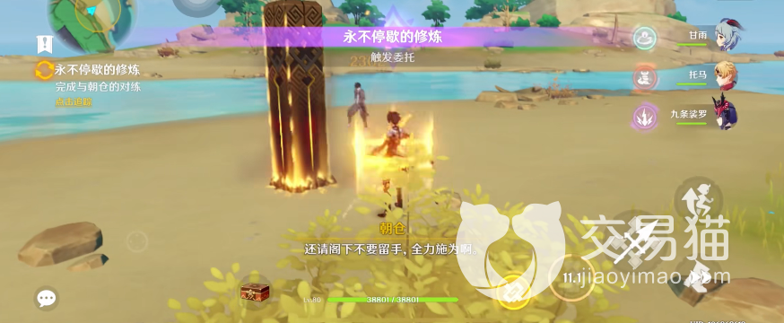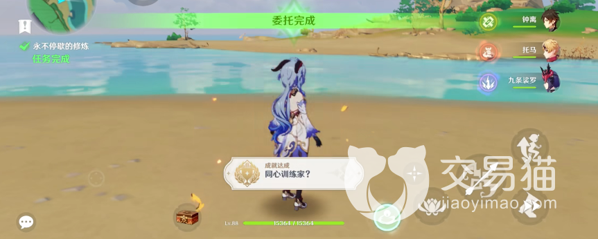 击退海乱鬼后再找到朝仓进行第五次对练,此时会触发新的任务,名为“永不停歇的修炼”,这个任务的流程和以往的对练类似,玩家只要像往常一样继续击败朝仓即可。击败它以后,该任务就会显示完成,同时,一个名为“同心训练家”的隐藏成就也会赠予到玩家。