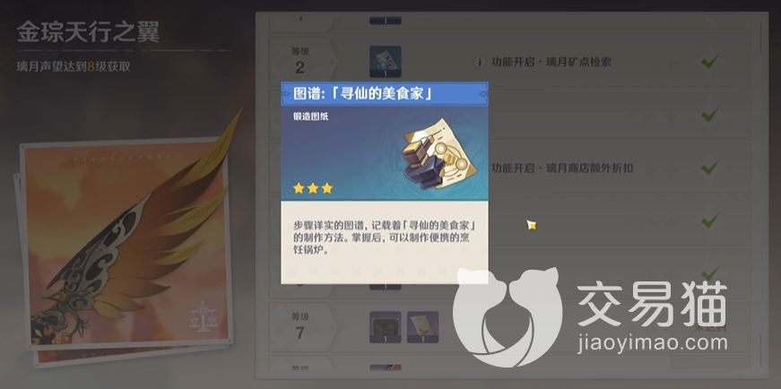 最后大家如果不小心将自己唯一的“寻仙的美食家”给用掉以后也不要太担心,因为它是可以反复制造的,具体方法是找到璃月总务司的干事小雨,之后点进声望相关板块可以看到一个金琮天行之翼的任务,其中的部分任务都会提供“寻仙的美食家”的图谱奖励,拿着这个图谱去找到名为老章的铁匠后即可制造该道具。