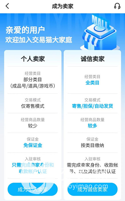 成为交易猫平台的卖家是需要审核的,相对来说申请个人卖家的审核环节会更简洁一些,但是经营类目、交易模式等都会受到一定的限制,没有诚信卖家的权限那么大。所以如果真的是想要通过长期卖号来谋生,建议直接申请成为诚信卖家,虽然需要缴纳一定的保证金,但是后续的便利也是非常多的。