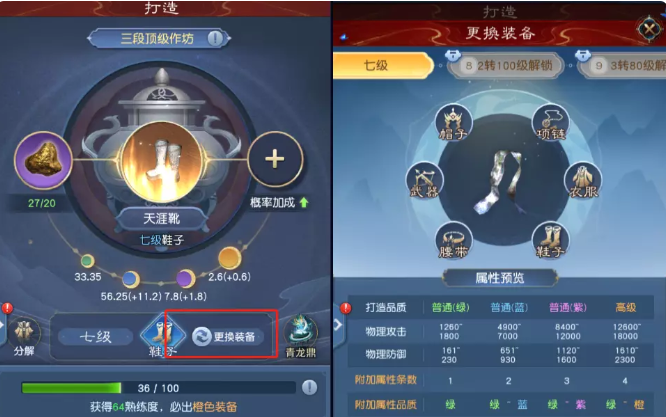 如果对这里最终呈现出来的属性不是很满意的话,就可以及时进行更换了,从中选择其他的装备进行制造。同时橙色装备通过打造呈现出来的基础属性是不一样的,所以各位一定要先了解清楚再制作。