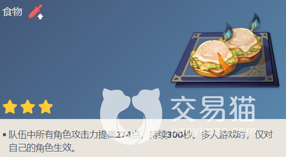两个新角色食谱分别是五星角色迪希雅的炽金之锅,被认为是镀金锅的上位版本,可以提高全队百分之三十的生命上限。另一个则是四星米卡的测绘员蛋堡,经典的汉堡类美食,提高全队攻击力的实用美食。