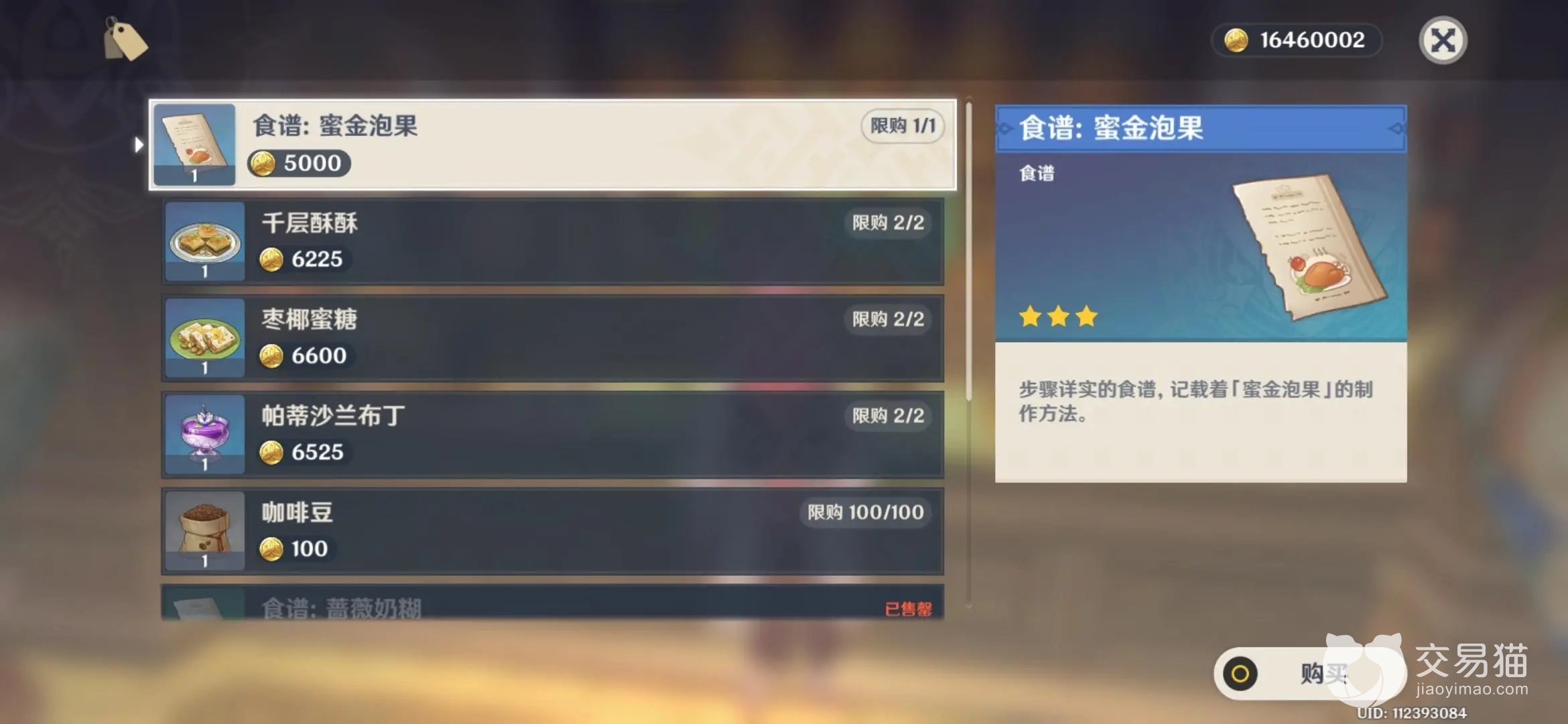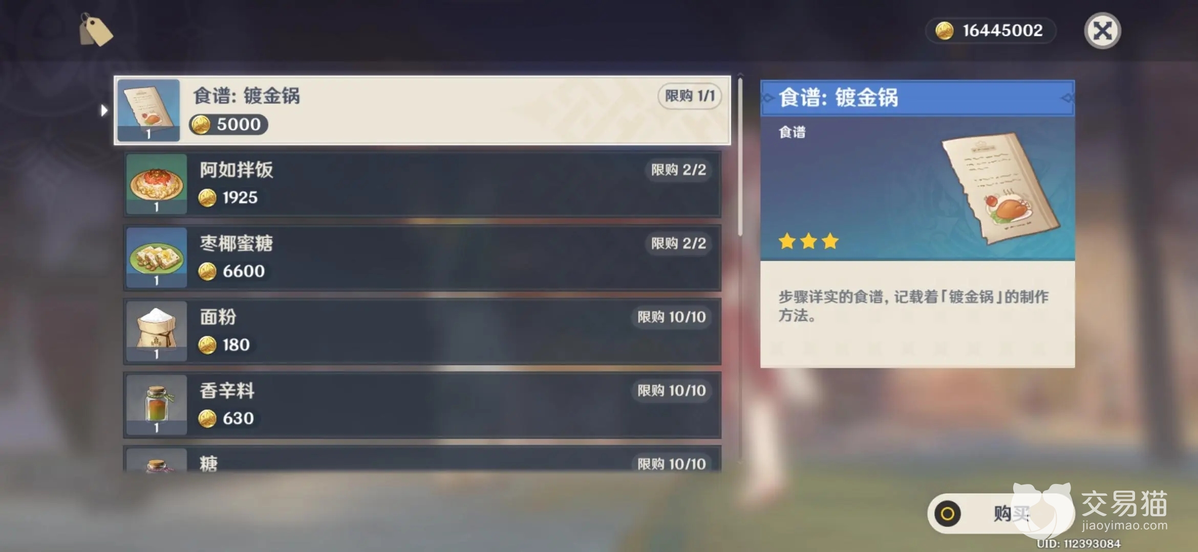 须弥区域两个食谱,一个是找到普斯帕咖啡馆的npc恩忒卡,和她对话后就可以获得蜜金泡果的食谱,这是一款符合须弥风情,并且适合在咖啡馆享用的甜品类食物。另一个则在阿如村和阿扎莱互动,获得镀金锅这种一锅炖的菜品。