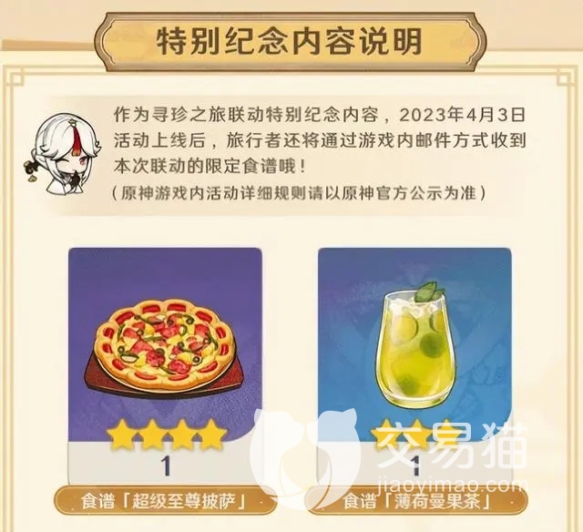 而剩下的两个,超级至尊披萨和薄荷蔓果茶都是现实中存在于必胜客的食物,这两个美食只要在活动期间上线,自动收到两个食谱,手头有素材就可以直接制作了。