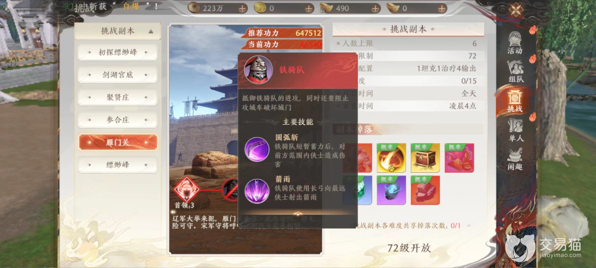 该副本属于比较高等级类型,要达到72级才能去挑战,推荐战力指数为65万左右,提高一些硬件有助于容错。第1个boss是辽国铁骑,需要在抵御骑兵进攻同时,阻止对方攻城车破坏城门。骑兵技能比较简单,主要有圆弧斩,剑雨和散射等技能,对前方范围内目标造成大量伤害,以及利用弓箭攻击距离比较远目标,要注意是在排成阵型冲锋时候注意躲开。