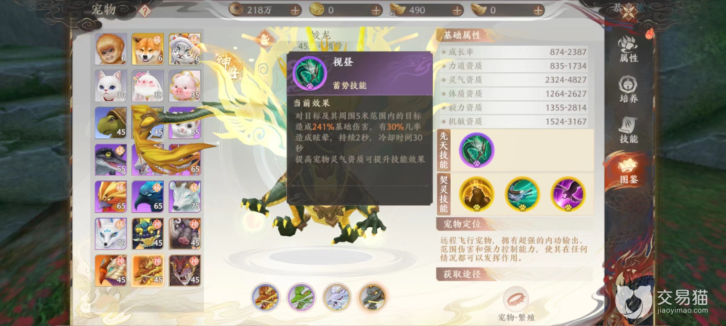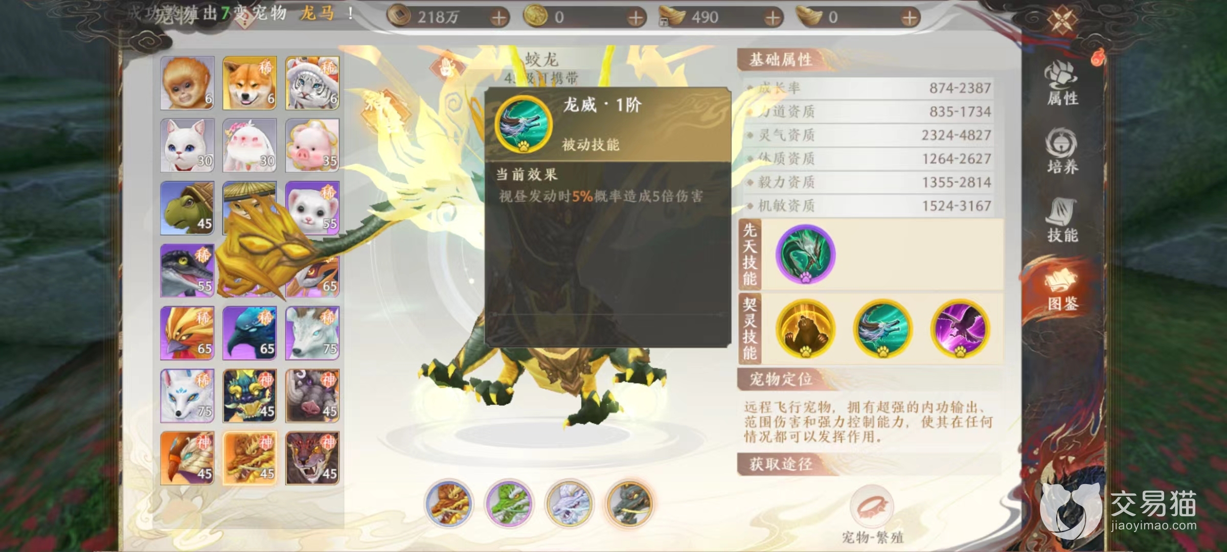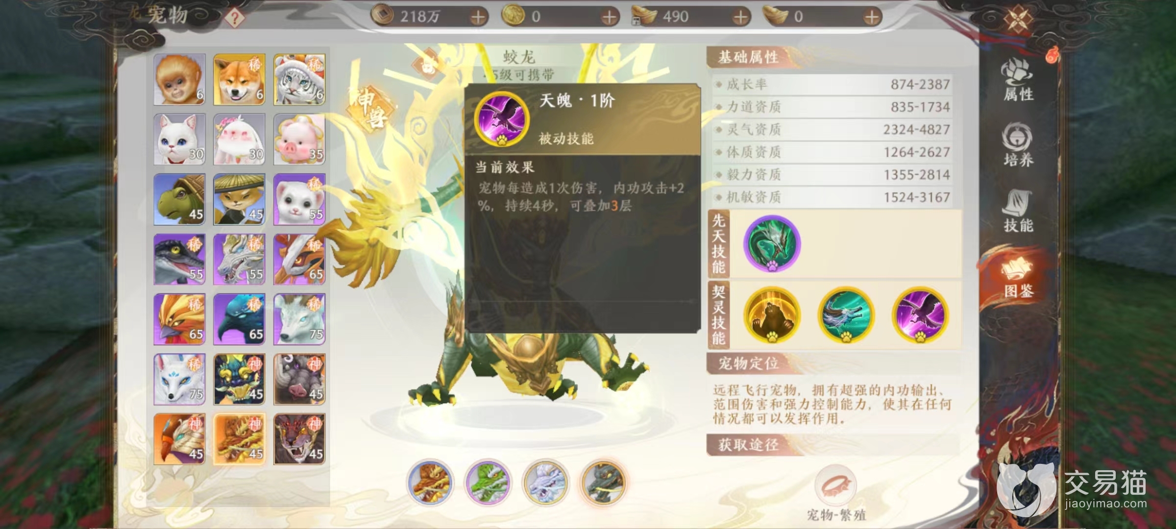 龙威则是在发动先天技能时有几率提高五倍伤害,也是一个比较看脸技能,一旦触发甚至可以直接秒掉敌人。天魄被动效果是蛟龙每输出一次,自身内功攻击就获得百分比叠加,最多能达到三层,每一层持续时间四秒。自身还属于飞行宠物,这一点和其他在陆地走的又多了一项优势。