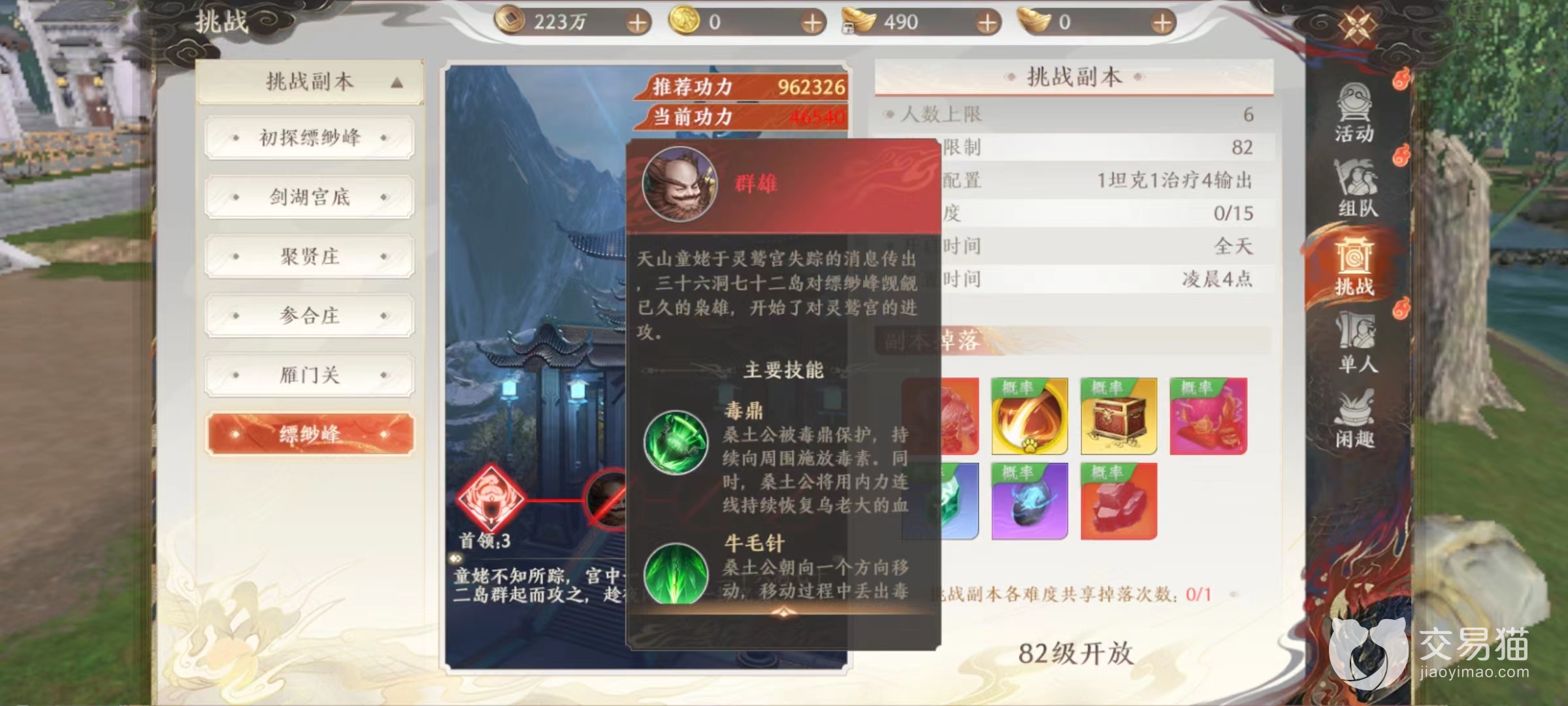 这是达到82级才会开放的挑战副本,建议功力指数达到96万左右再来战斗,这样才能扛住 boss所造成的群体伤害,不然即使肉盾治疗再给力输出,打不掉也是很难通关的。第1个面对的是七十二岛的群雄角色,主要作战对象有三个,分别是桑土公,乌老大和欧岛主。对于桑土公来说,会向周围不断释放毒素,并且利用自身内力不断给乌老大加血,这是比较难受的地方。