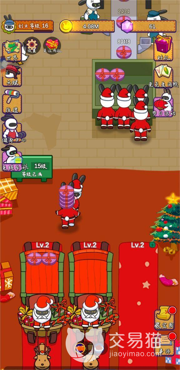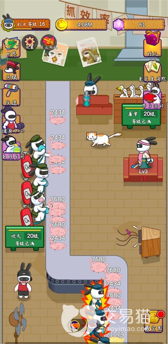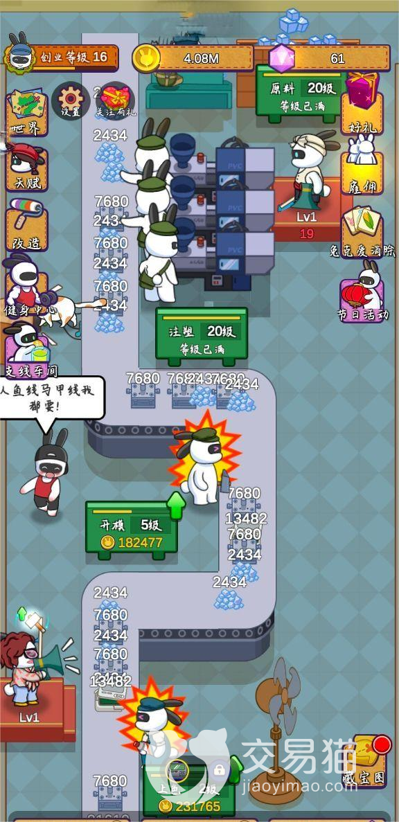 游戏中的工厂种类繁多,到现在为止,一共有八家独立的生产线,涵盖了食物,加工,玩具等等。而且,这款游戏还在研发之中,以后还会有更多的生产线和稀奇古怪的处理方式,类似有烤鸭车间,珍珠奶茶车间,牛排车间,还是煎饼果子车间,不得不说,这款游戏最有意思的地方,就是那些奇怪的兔子在工厂里的表演,看起来非常的有趣。