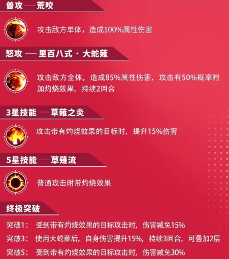 首先怒攻就能造成不错的单体伤害,并且会有概率带来灼烧效果,可以持续两个回合,在该状态下敌人不仅仅会持续掉血那么简单,你接下来的攻击会带来额外15%的输出提升。如果你升到了五星那么普攻也能无限烧人,后面的各种特效也就很容易触发了,紫卡想满星还是挺简单的。