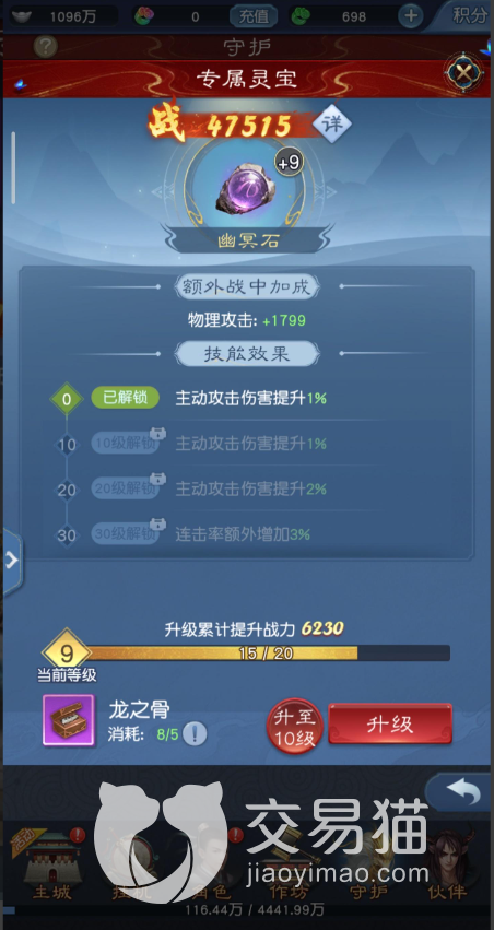 在本作游戏中,除了基本的成长以外,让我们对于守护提升方面最大的就是灵宝。培养不同的专属灵宝,基本上都要20级之后就能看出差异。虽然在前期方面可以提供的加成不多,但是到后期,高品质的灵宝配合相应的守护,可以额外的提升百分比的加成,可以说,越到后期越强。
