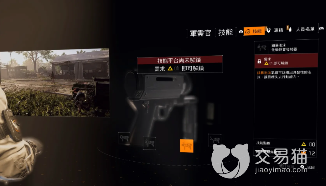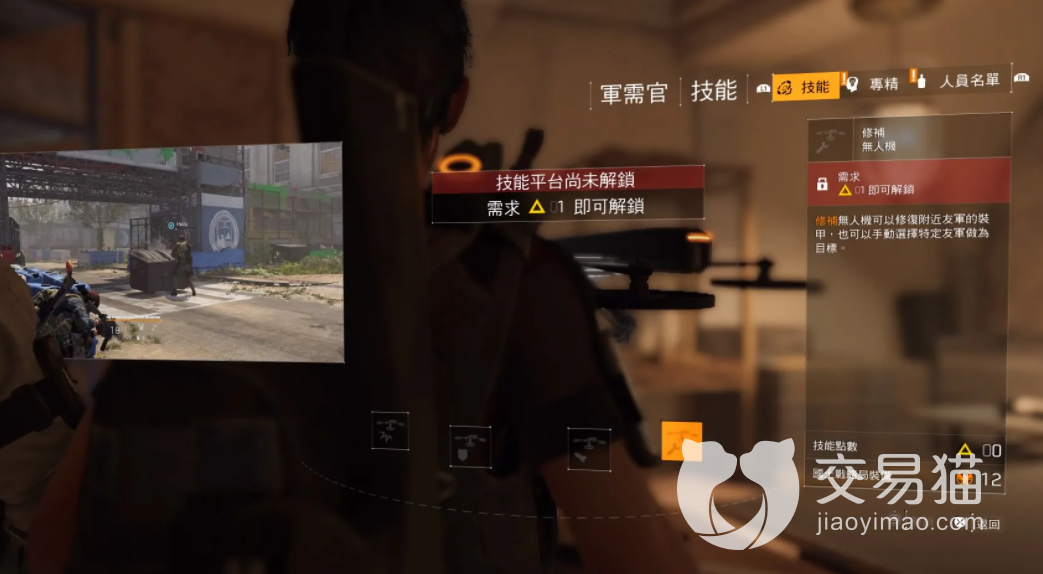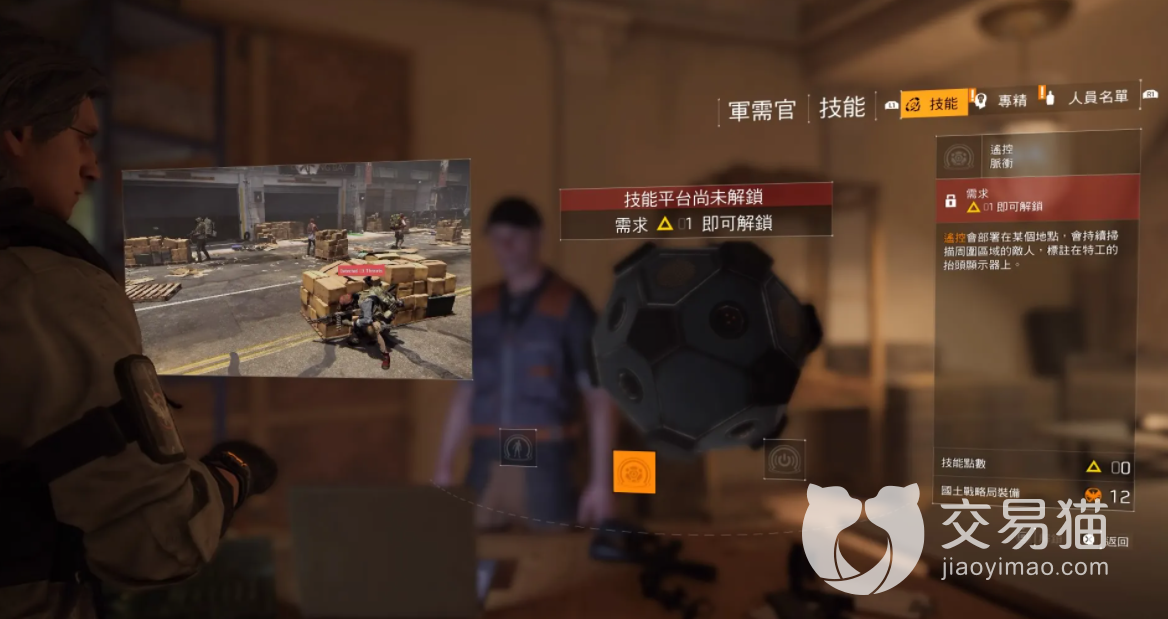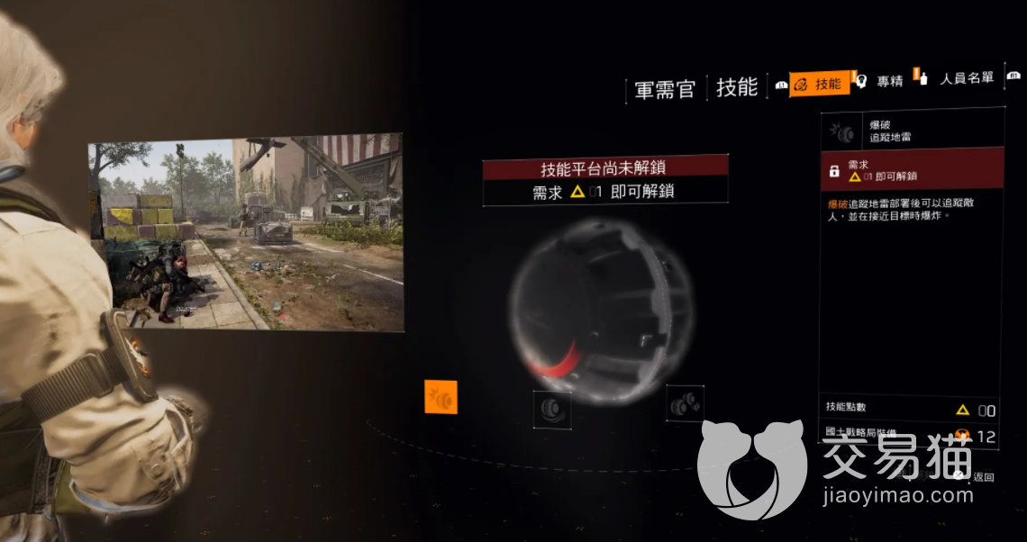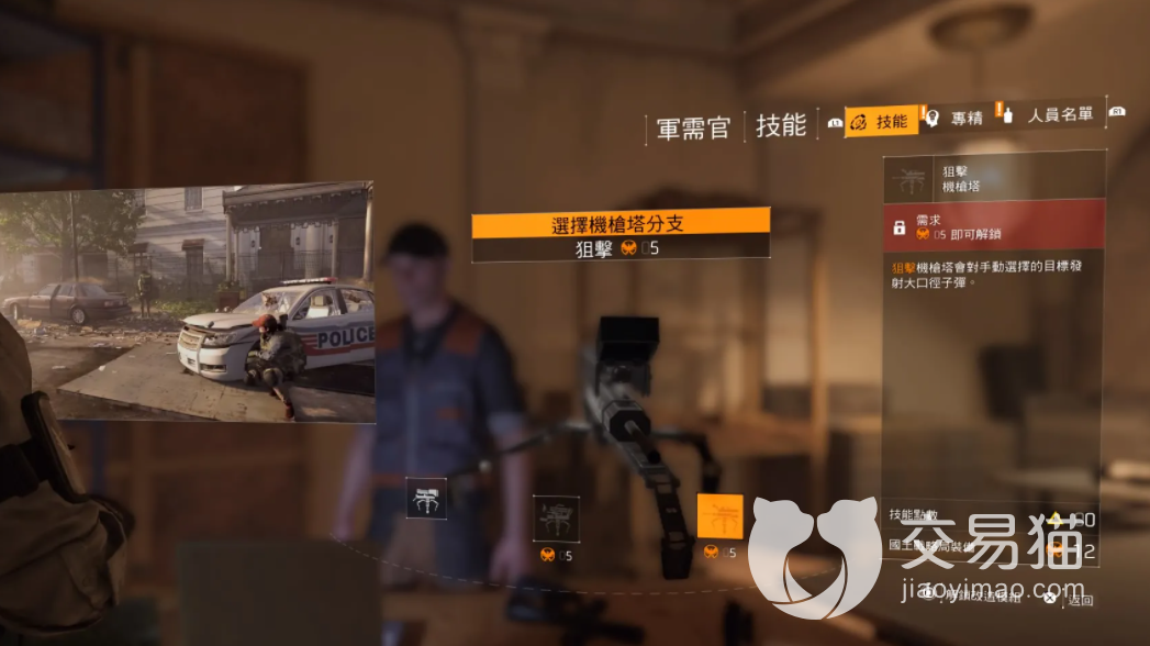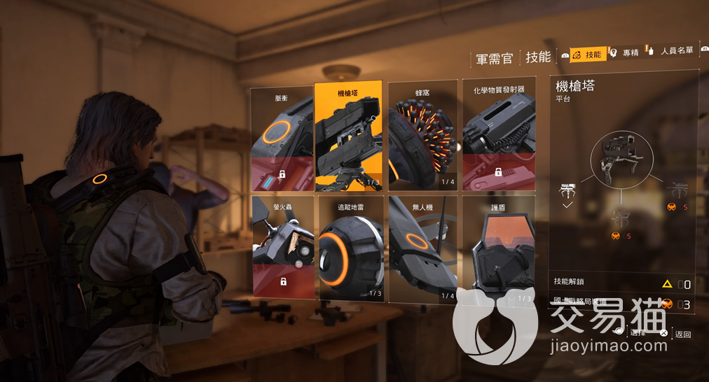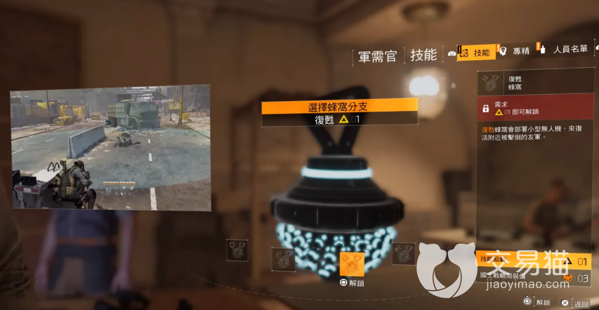 全境封锁2因为其设定的写实性,是距离现在不久的未来,所以在技能方面不会有什么超乎常理的设计,基本都是处于合理的轻度科幻范畴。表现为各种高科技装置和道具,可以协助玩家的战斗。游戏中这样的道具有八个分类,脉冲,机枪塔,蜂窝,化学发射器,萤火虫,追踪地雷,无人机,以及护盾。对应的技能特效都截然不同,玩家初次解锁时会用到技能点,后面要去地图找箱子获得专精才可以解锁分支。目前允许玩家携带两个技能,进攻向搭配防御向或者功能向都是很随意的,根据你的装备和打法来具体选配。