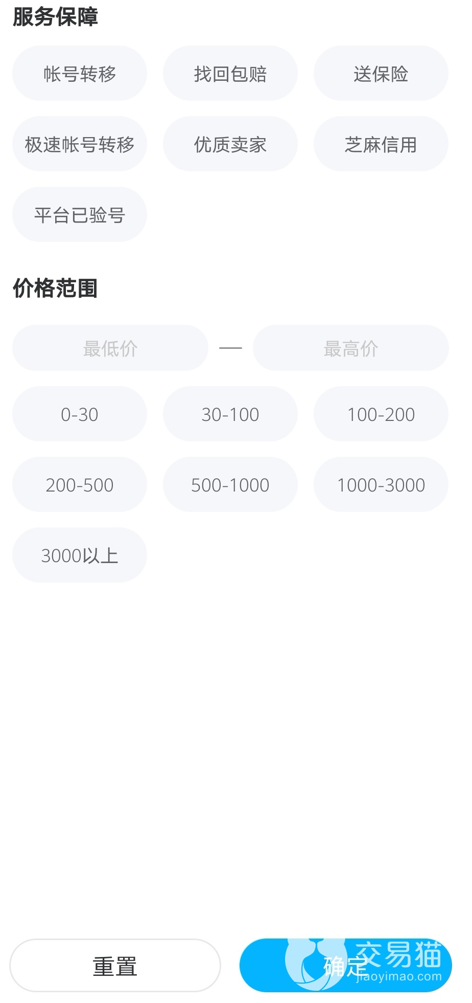 而且大家在购买账号的时候要尽可能的选择有服务保障的去购买,比如找回包赔、账号转移和安心购等等,这些服务保障都是可以根据筛选功能去选择的,还可以对价格的区间进行设置,这样就可以帮助大家更快速的找到你想要的资源和账号了。