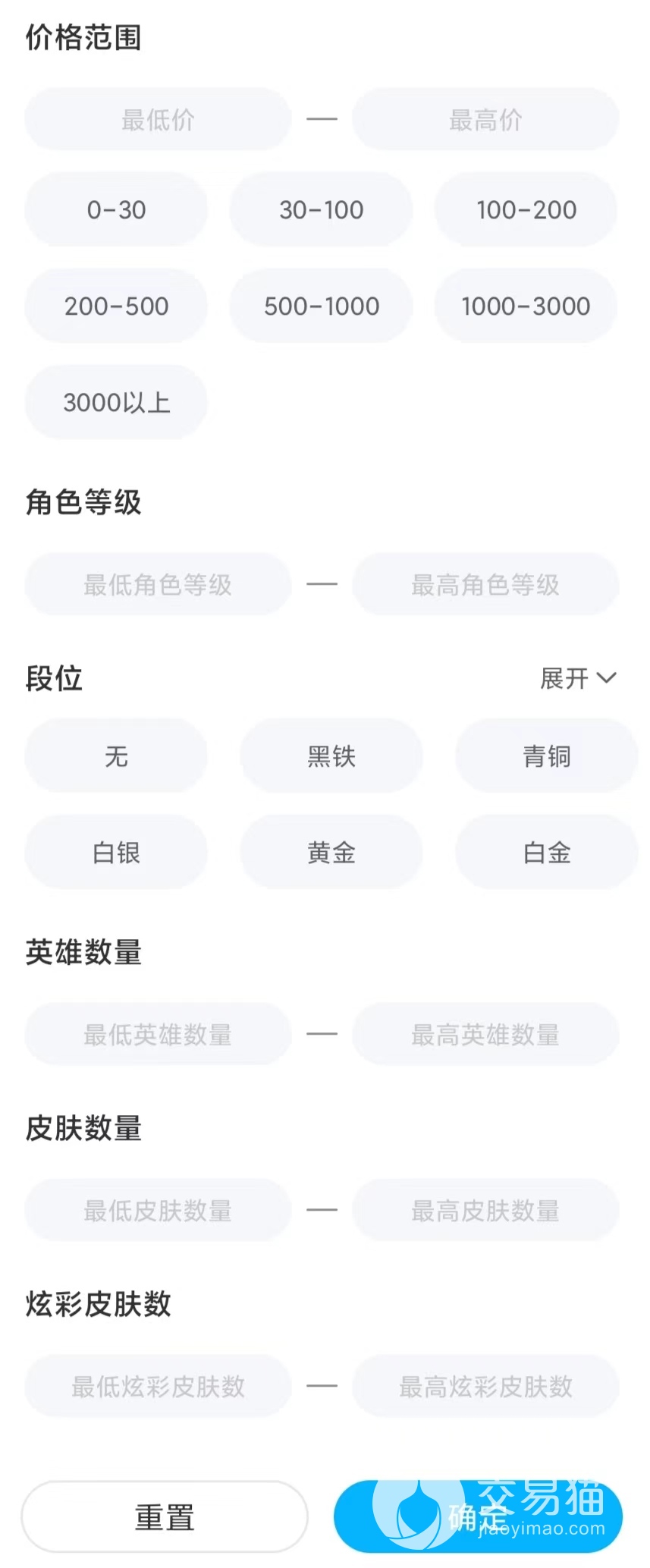 玩家给lol账号估值的第一步就是了解清楚自己的账号的段位、英雄数量、皮肤数量以及幻彩皮肤数量,然后玩家根据自己账号的情况在交易猫上的筛选栏填入或选择相应的信息,这样交易猫系统会帮助玩家筛选出与玩家账号相似的账号,玩家再在这些账号中选择与自己账号匹配度最高的账号,然后根据所选的账号的价格来给自己的账号定个价。交易猫的筛选功能会让给账号估值事情变得简单很多。