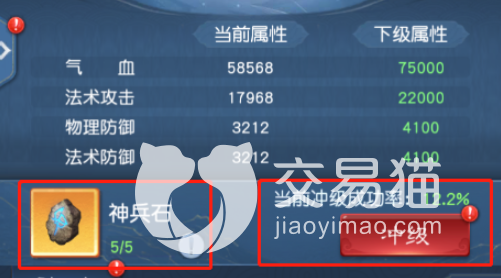 特别是在打那些高品质妖王的时候,对付它们再额外使用道具的话会比较亏。各位在获取到升级材料以后就可以在神兵界面点击按钮进行升级了,此处是会有几率失败的,不过即便这样也可以再提升一些属性值。