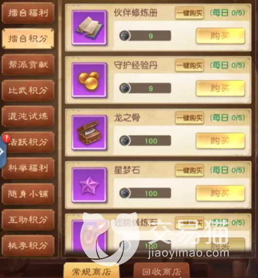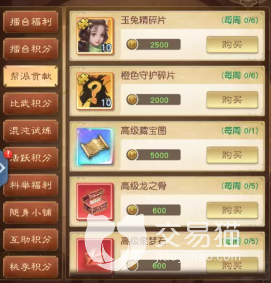 下一块区域是帮派贡献,里面推荐的物品时高级藏宝图还有天赋卷轴,各位通常能将这两个换取到就已经很好了,如果有多余就可以在看看是否有自己需要的,但是其中的同修丹是最不建议换取的。