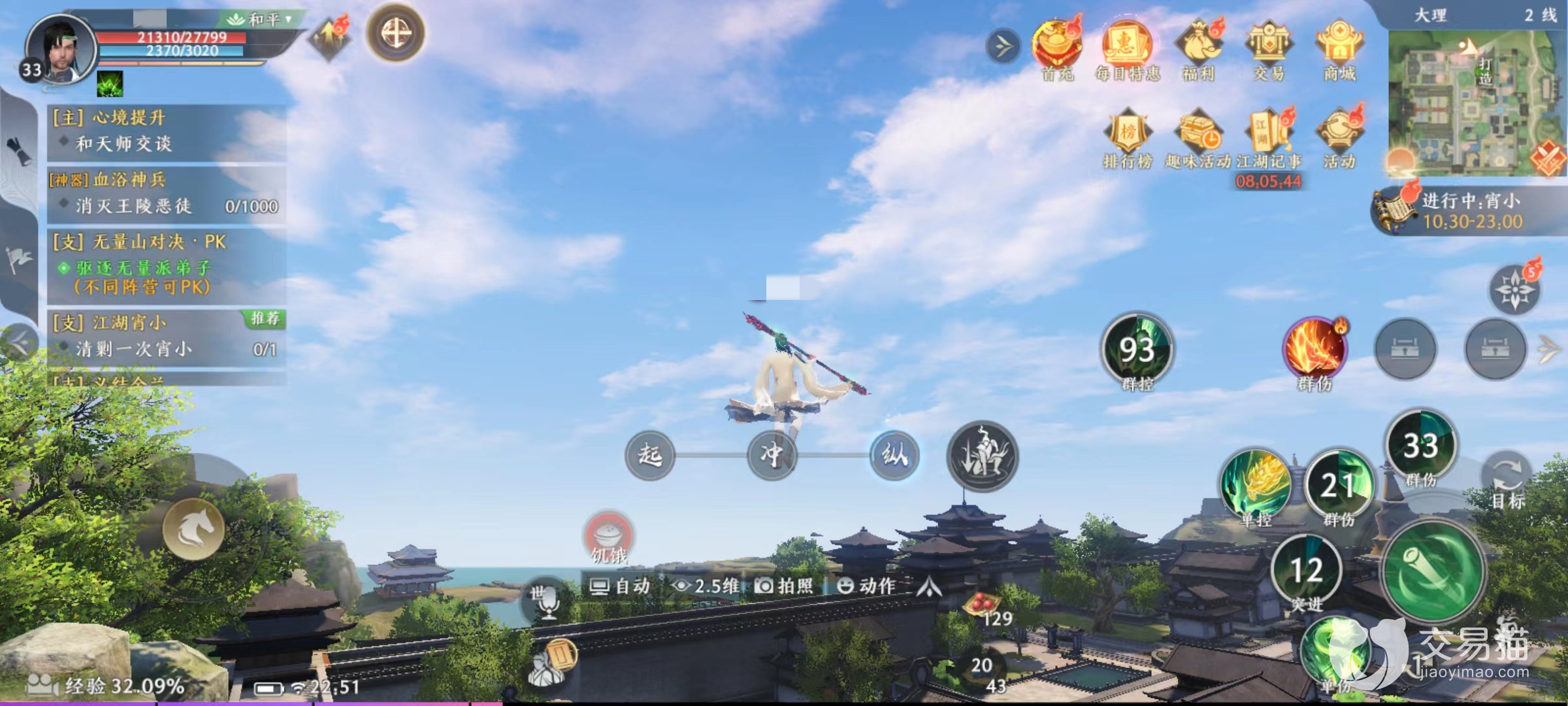 无论是在日常操作还是在战斗中,都可以看到右下角有一个人物跳跃图标,这就是轻功触发按钮,只需要点击一下就可以腾空而起。接下来就是轻功连招环节,主要包括起、冲、纵这三个不同功能。也可以理解为三段跳,当起身之后如果再按一下按键就切换到冲,可以向前方冲刺一段距离。但是距离不会太长,在冲之后,如果没有找到合适的借力点,会慢慢的向下坠落,也可以利用下坠直接快速降落到地面。